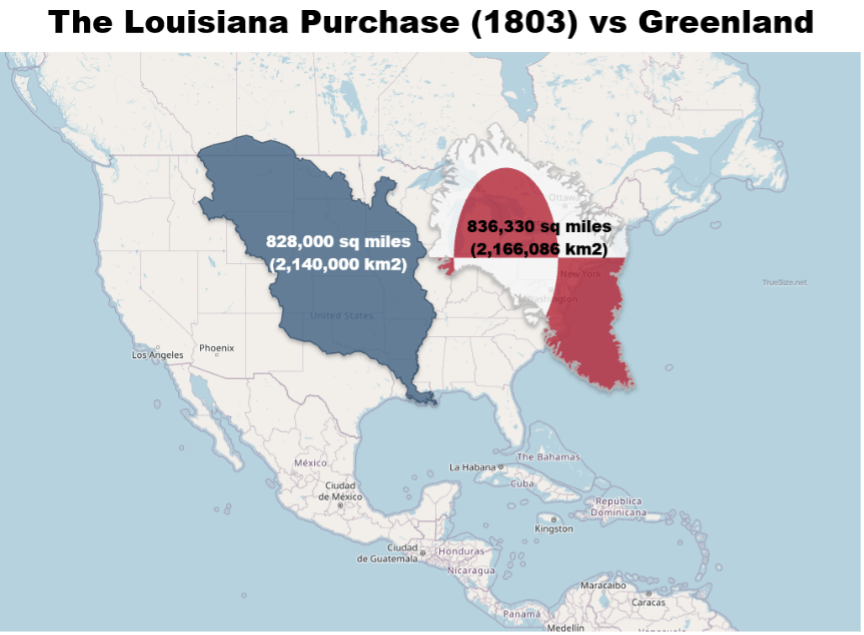 Then there’s Greenland, which in terms of square miles is about 25% larger than Alaska, acquired in 1867 by President Andrew Johnson and his dynamic Secretary of State, William Seward. And while we’re measuring metes and bounds, Greenland just edges out the Louisiana Purchase of 1803, a key accomplishment of President Thomas Jefferson.