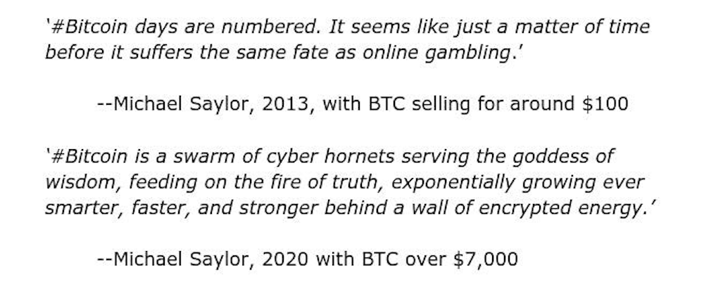This experience might have induced a lesser man to go straight. But Saylor kept at it. He had bought up some domain names — such as Angel.com, Wisdom.com and Voice.com — which he was later able to sell at a profit. Then, with the price of bitcoin around $8,000…he became over-enthusiastic.