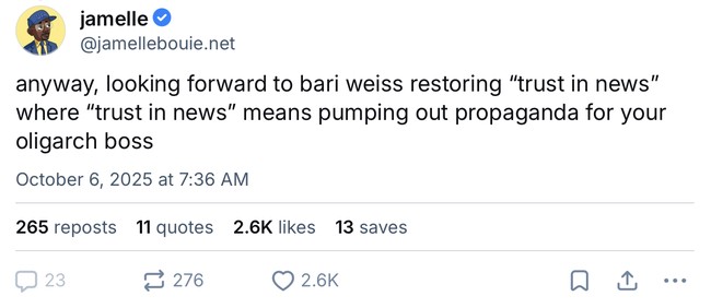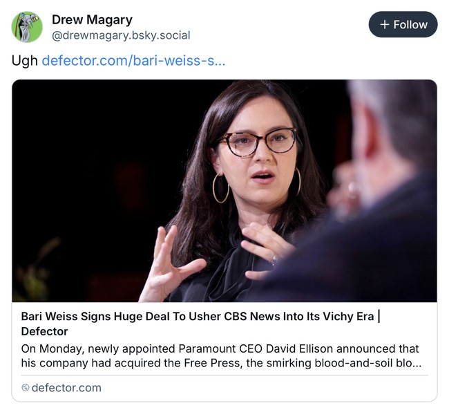 Jamelle Bouie must be losing his touch, comparing CBS under Weiss to mere oligarchs instead of actual Nazis.