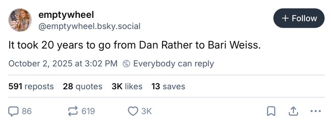 I only mention Bluesky because today I set up an account there — I haven’t posted yet, because I will almost certainly have my account suspended within hours or minutes of being honest — after The Spectator’s Stephen L. “Redsteeze” Miller encouraged people this morning to log in and do a search for Bari Weiss, and witness the murderous meltdowns.