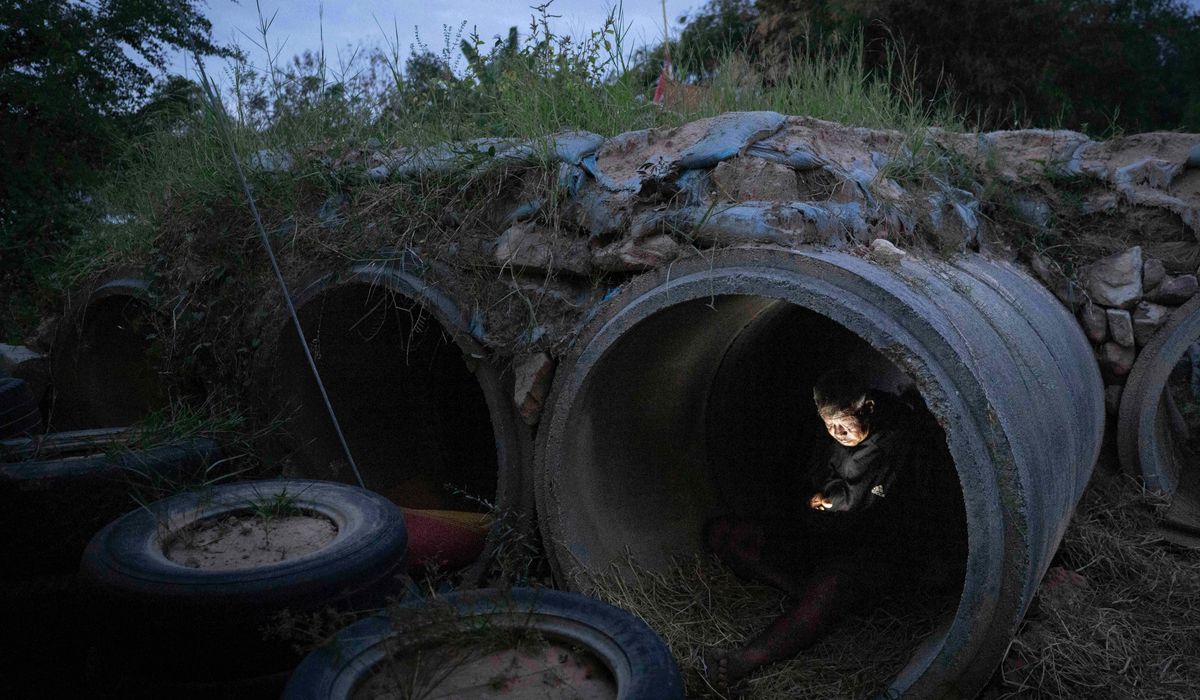 An evacuation shelter at a university in Thailand’s northeastern city of Surin is hosting more than 3,600 people. Evacuees sit or lie on thin mats spread across the floor, and several have set up small tents in their allotted areas as sleeping spaces.