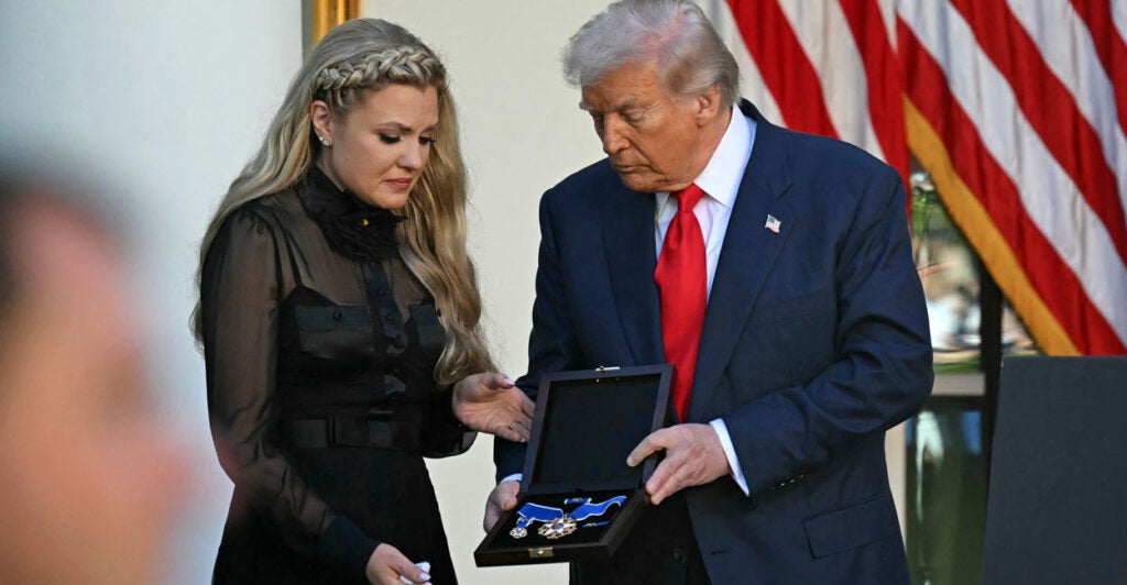 President Donald Trump presents Erika Kirk, Charlie Kirk’s widow, a Presidential Medal of Freedom in his honor and memory in a ceremony in the Rose Garden of the White House on Tuesday. (Andrew Caballero-Reynolds/AFP via Getty Images)