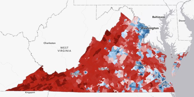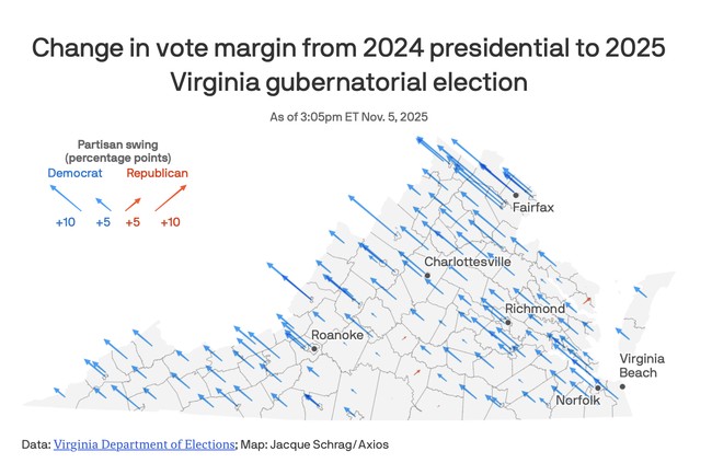 For example, Axios created and posted this map this morning, showing how voting moved left from the 2024 presidential election to the 2025 gubernatorial election across almost every single town in Virginia: