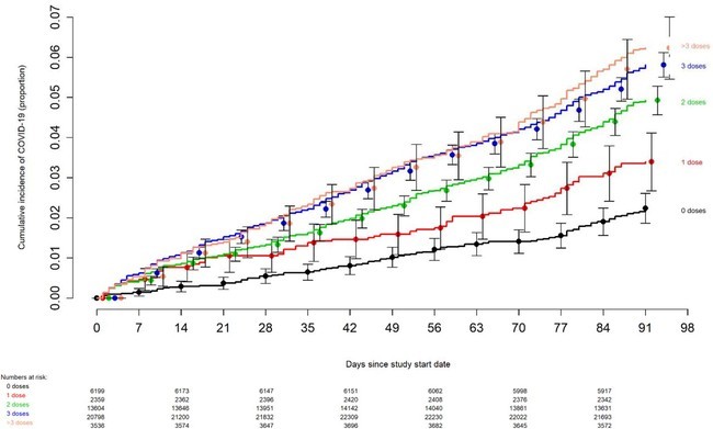 The evolution of the SARS-CoV-2 virus necessitates a more nuanced approach to assessing the potential impact of vaccination than when the original vaccines were developed. Additional factors beyond vaccine effectiveness need to be considered. The association of increased risk of COVID-19 with higher numbers of prior vaccine doses in our study, was unexpected. A simplistic explanation might be that those who received more doses were more likely to be individuals at higher risk of COVID-19. A small proportion of individuals may have fit this description. However, the majority of subjects in this study were generally young individuals and all were eligible to have received at least 3 doses of vaccine by the study start date, and which they had every opportunity to do. Therefore, those who received fewer than 3 doses (>45% of individuals in the study) were not those ineligible to receive the vaccine, but those who chose not to follow the CDC’s recommendations on remaining updated with COVID-19 vaccination, and one could reasonably expect these individuals to have been more likely to have exhibited higher risk-taking behavior. Despite this, their risk of acquiring COVID-19 was lower than those who received a larger number of prior vaccine doses. This is not the only study to find a possible association with more prior vaccine doses and higher risk of COVID-19. A large study found that those who had an Omicron variant infection after previously receiving three doses of vaccine had a higher risk of reinfection than those who had an Omicron variant infection after previously receiving two doses of vaccine [21]. Another study found that receipt of two or three doses of a mRNA vaccine following prior COVID-19 was associated with a higher risk of reinfection than receipt of a single dose [7]. We still have a lot to learn about protection from COVID-19 vaccination, and in addition to a vaccine’s effectiveness it is important to examine whether multiple vaccine doses given over time may not be having the beneficial effect that is generally assumed.
