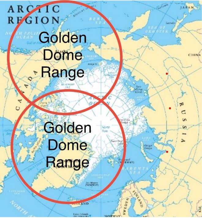 And if – actually “when” – the U.S. puts a large-scale strategic missile defense system into operation (call it “Golden Dome” if you wish), the most appropriate sites are Alaska for western defense, and Greenland for defense of the Eastern U.S.; here’s that map:
