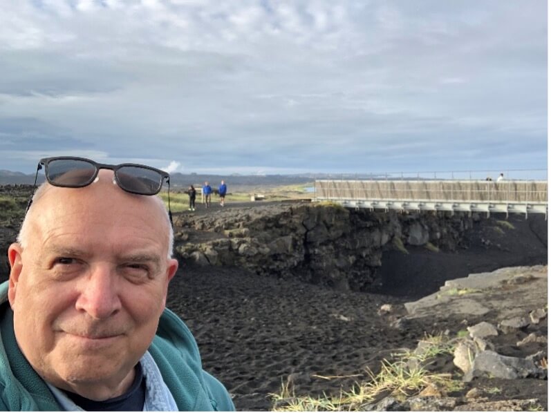 In fact, this is me in southwest Iceland, at the Reykjanes Ridge, standing directly atop the Mid-Atlantic suture that divides the North American tectonic plate from the Eurasian plate.