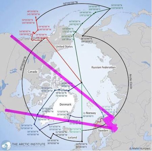 Russian missile flight paths from Kola Peninsula towards North America. Courtesy Arctic Institute.