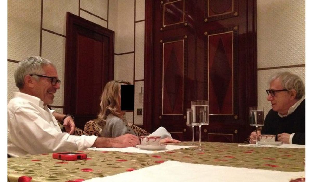 A photo of Donald Trump smiling while surrounded by young women. Jeffrey Epstein standing beside filmmaker Woody Allen. A signed photograph from former President Bill Clinton smiling with Epstein.