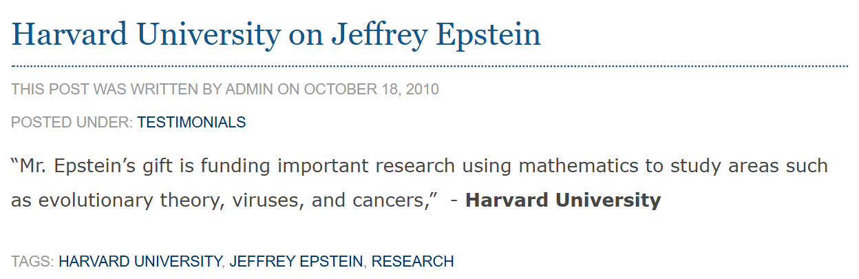 It prominently features Epstein’s support of Martin Nowak, the head of the Program for Evolutionary Dynamics (PED) at Harvard, whom Epstein’s website claimed he supported with $30 million in funding by 2010, though the university disputes that figure, placing it at $6.5 million. Summers, then the president of Harvard, helped Epstein establish the lab in 2003 alongside Harvard mathematician Benedict Gross, according to the program’s website at that time.