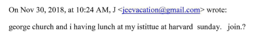 “George church and i havng lunch at my istittue [SIC] at harvard sunday. join.?” he wrote to new age guru Deepak Chopra in a November 2018 email. Church is a Harvard Medical School geneticist and former dean of Harvard College who accepted an estimated $2 million from Epstein-connected donors.