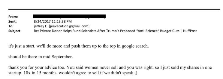 In 2017, Epstein positioned himself as a counterforce to Trump in science funding. Another publicist placed an opinion piece in the Huffington Post with the headline “Private Donor Helps Fund Scientists After Trump’s Proposed ‘Anti-Science’ Budget Cuts” featuring Epstein’s support of Nowak, Llyod, Minksy and others, generating yet another positive hyperlink.