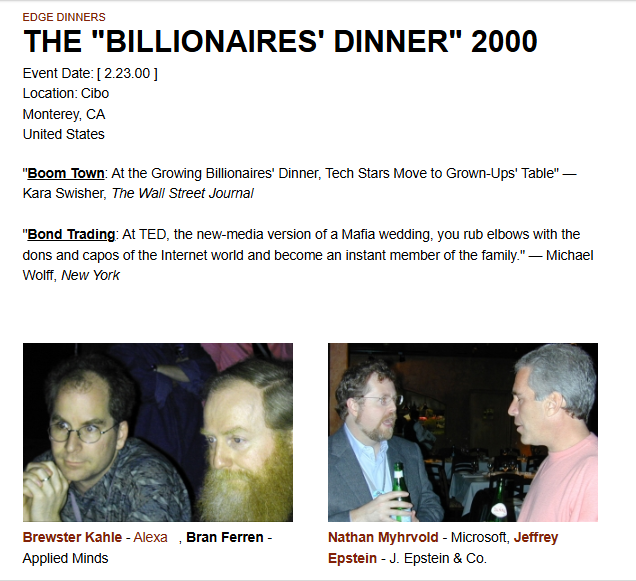 The Edge Group hosted an annual event referred to as “Billionaires’ Dinners” timed with the annual Ted Conference from 1999 to 2015.