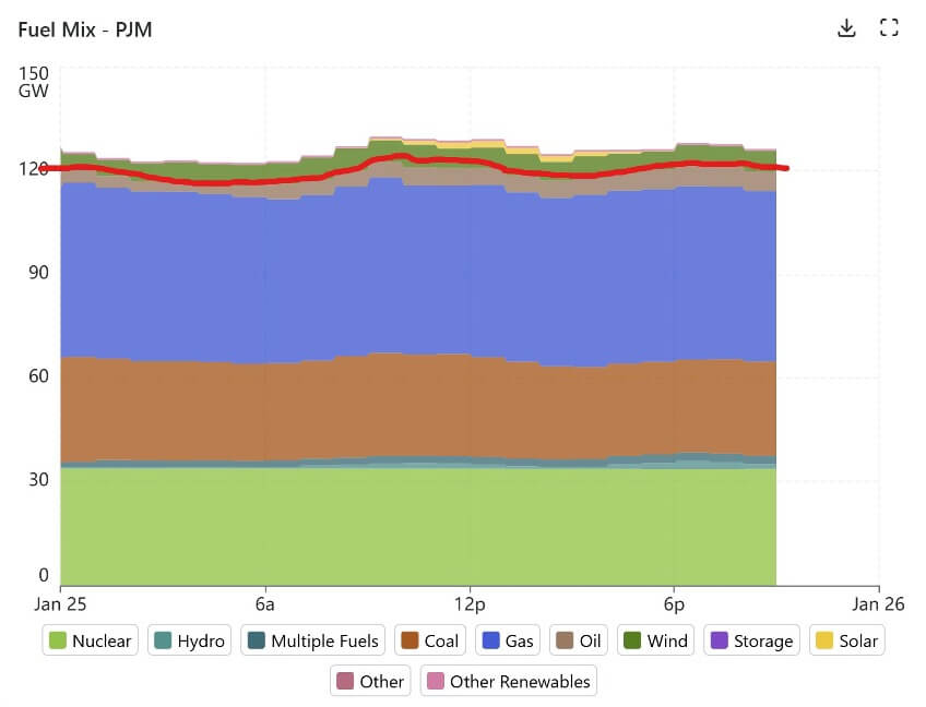 That is, over the past few days, Jan. 25 – 26, most of your electric power was generated by a supply stack of nuclear (light green), coal (brown), natural gas (light blue), and relatively small amounts of oil and hydro; that is, everything below the red line on the image.