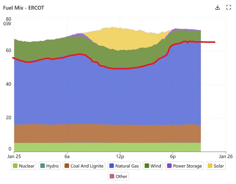 Notice that red line again. Everything below it is traditional sources, namely nuclear, coal and gas. But Texas has wind when it blows, and solar by day, although both of these sources dropped offline hard during the early phases of the recent winter storm. The makeup energy form was natural gas, which came online within moments of flipping the switches.