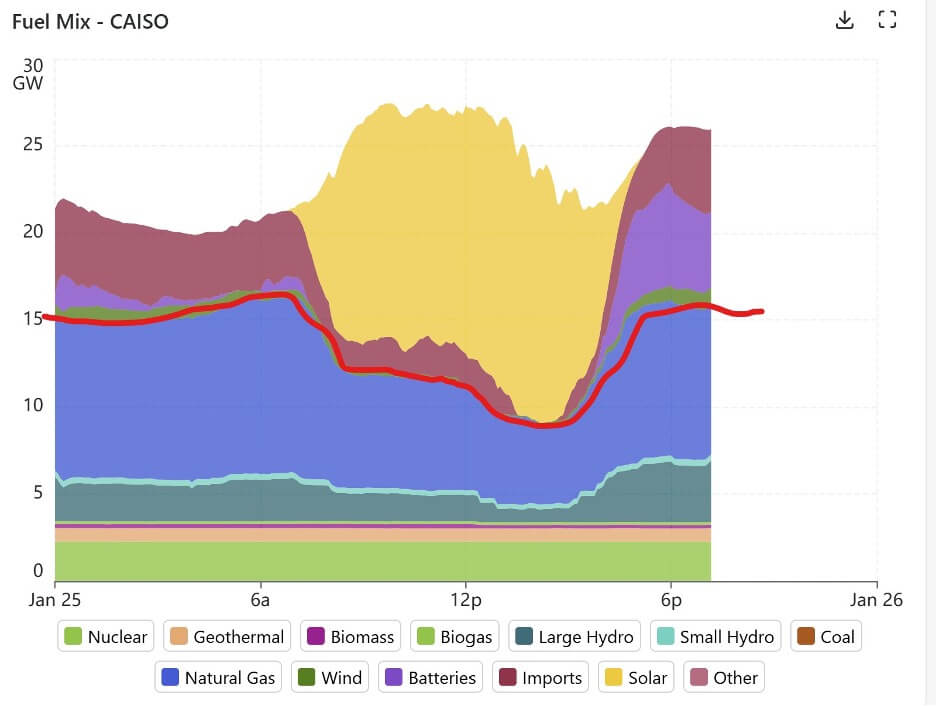 Over the past two days, California’s daily power baseline was a stack of nuclear, natural gas, and some geothermal and large-scale hydro, all shown below the red line. Plus, there’s a large whack of solar by day, and even some batteries by early evening, until they discharge; oh, and they’re not made in the U.S. if you care about things like that.