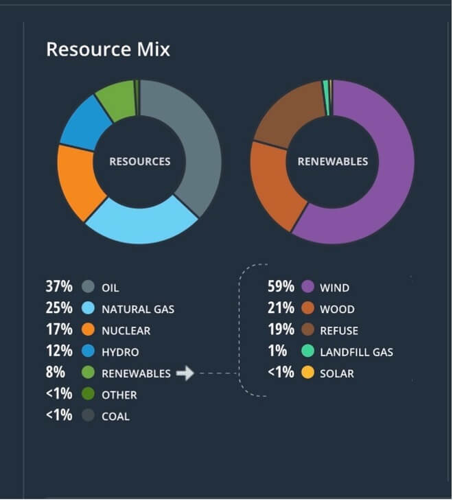 In the renewable department, New England harnesses some wind, when it blows; about 5% of total electric power overall. Plus, the region burns wood and “refuse,” a polite way of saying that they burn trash. Solar is negligible, even amongst the renewable mix.