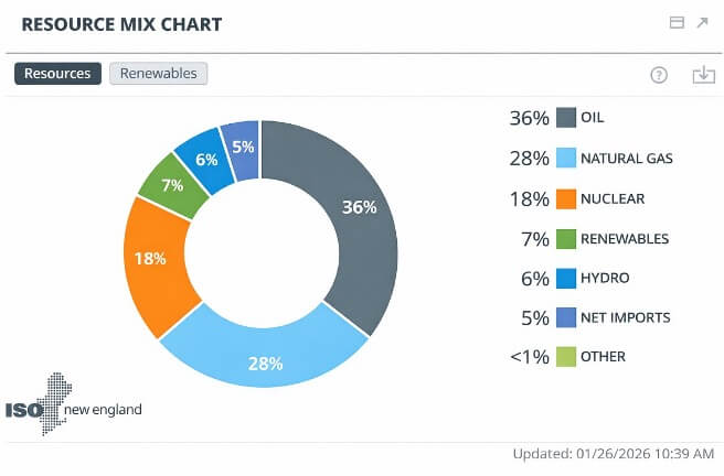 Also from the charts, you can see something quite strange; and you’re reading it correctly. That is, about one-third of New England’s power is derived from “oil,” and no, not whales. In fact, New England burns significant diesel fuel or other heavy petroleum fractions for power and heat, 36% per the latest numbers!