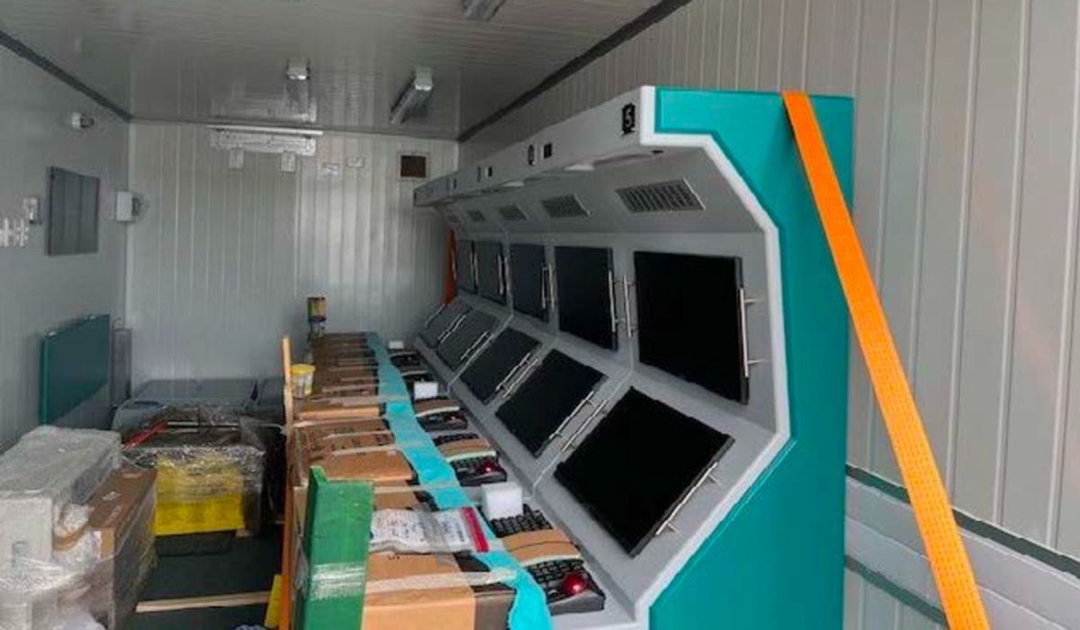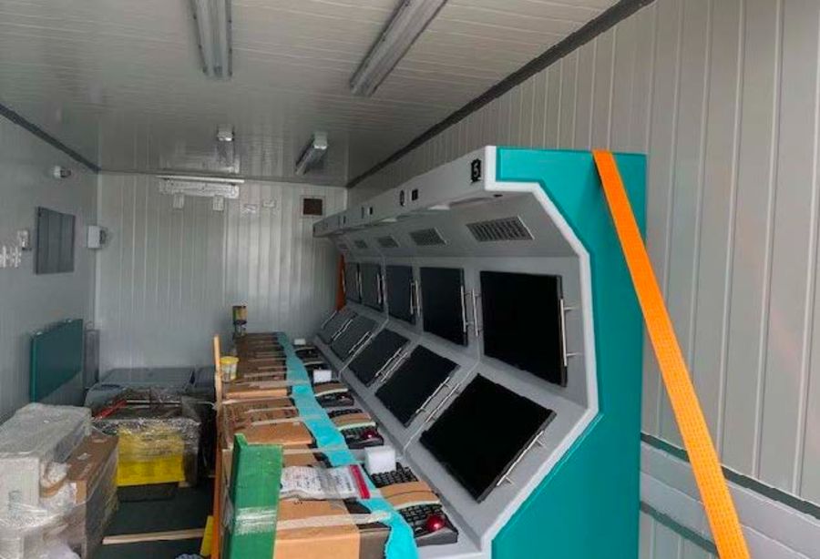 The mobile trainers were shown in a photo inside one of the containers as a series of about 12 terminals that are flight simulators.