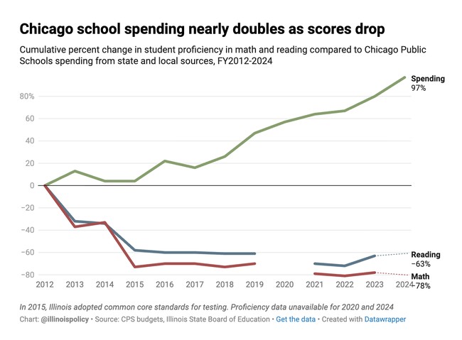 Test scores and academic performance have continued to drop, while education spending has continued to rise – with most of the spending on payroll. Since 2012, education spending has increased by 97%, while reading proficiency has decreased by 63% and math proficiency by 78%.