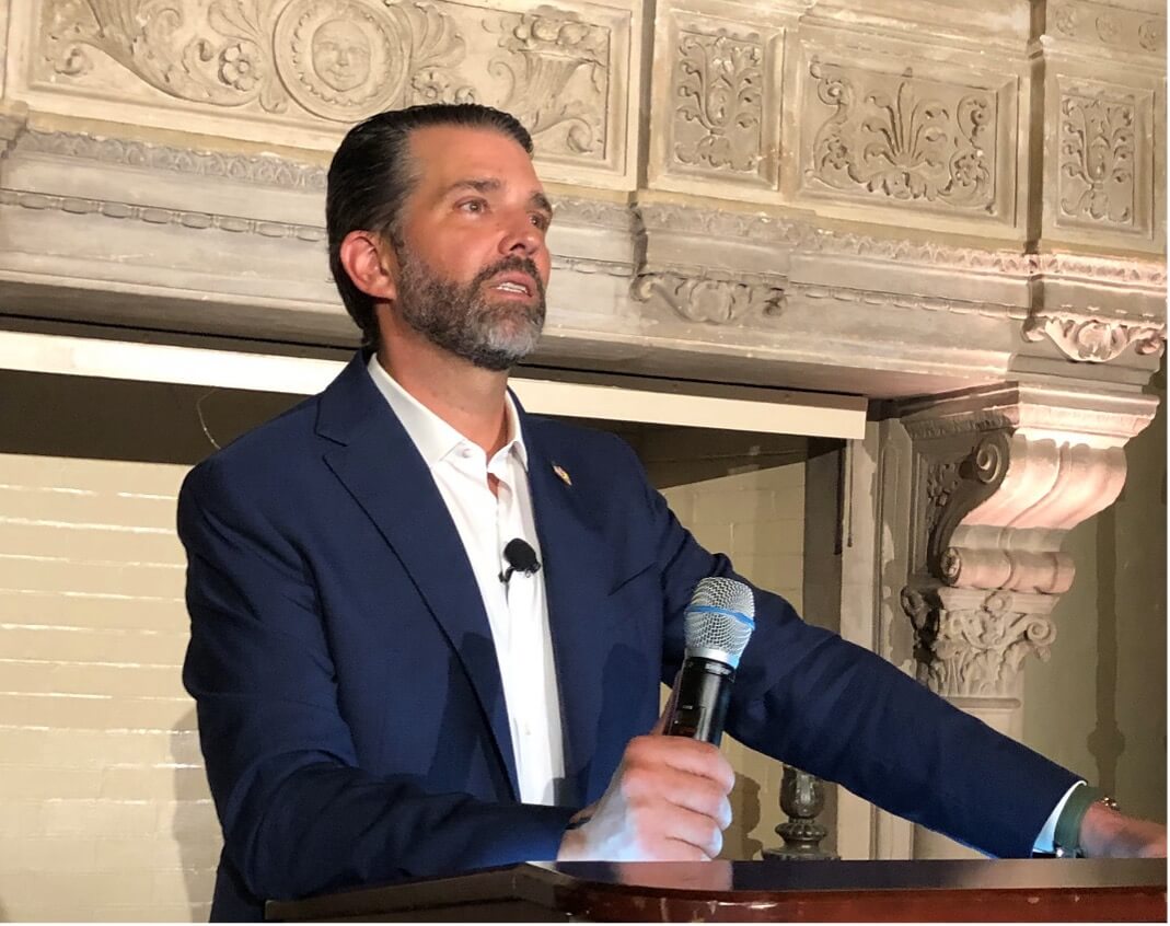 The day faded into late afternoon and early evening, which led to a reception adjacent to a dining area. At one point the lights flickered, our cue to take our assigned seats. The room was noisy and echoed with everyone talking. Then came the loud ring of a bell, followed by a booming voice: “Ladies and gentlemen, our guest of honor, Donald Trump Jr.”