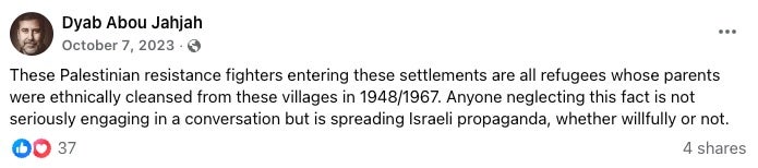 “These Palestinian resistance fighters entering these settlements are all refugees whose parents were ethnically cleansed from these villages in 1948/1967. Anyone neglecting this fact is not seriously engaging in a conversation but is spreading Israeli propaganda, whether willfully or not.”