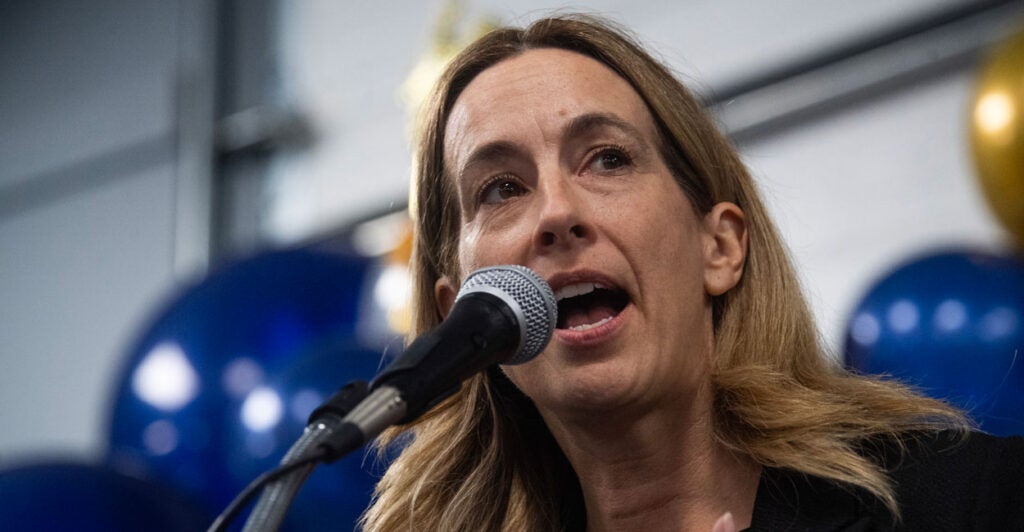 The Democratic candidate for New Jersey governor, Mikie Sherrill, addresses a campaign event in Westville, New Jersey, on Oct. 11. (Matthew Hatcher/Getty Images)