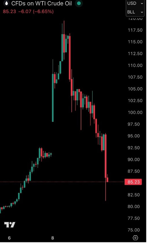 West Texas Intermediate (WTI) oil price chart for Monday, March 9, 2026.