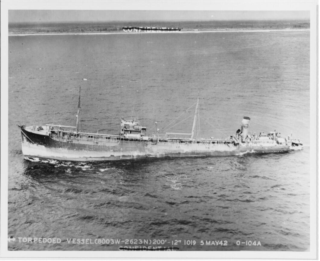 American tanker torpedoed and sunk, May 1942. Courtesy U.S. Navy/National Archives.
