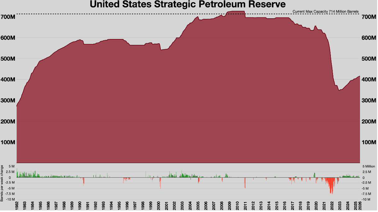 SPR barrels in storage, 1982 – 2026. Based on DOE data.