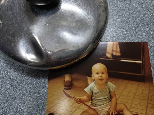 Oh, my gosh – struck such a chord. The picture that heads this post is of an ever-so-young Ebola* on the kitchen floor, armed with a spoon, and hubby’s heel at the counter in the background. That’s where he spent so much of his time, right there on the floor, and the ancient, beaten-to-a-pulp Revere Ware lid is proof.