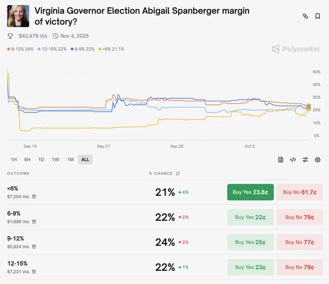 On Polymarket, the real money is no longer focused on whether Spanberger will win–she is at 90% chance of victory–but by how much. The predictions are for a blowout, and the competition is to guess by how much.