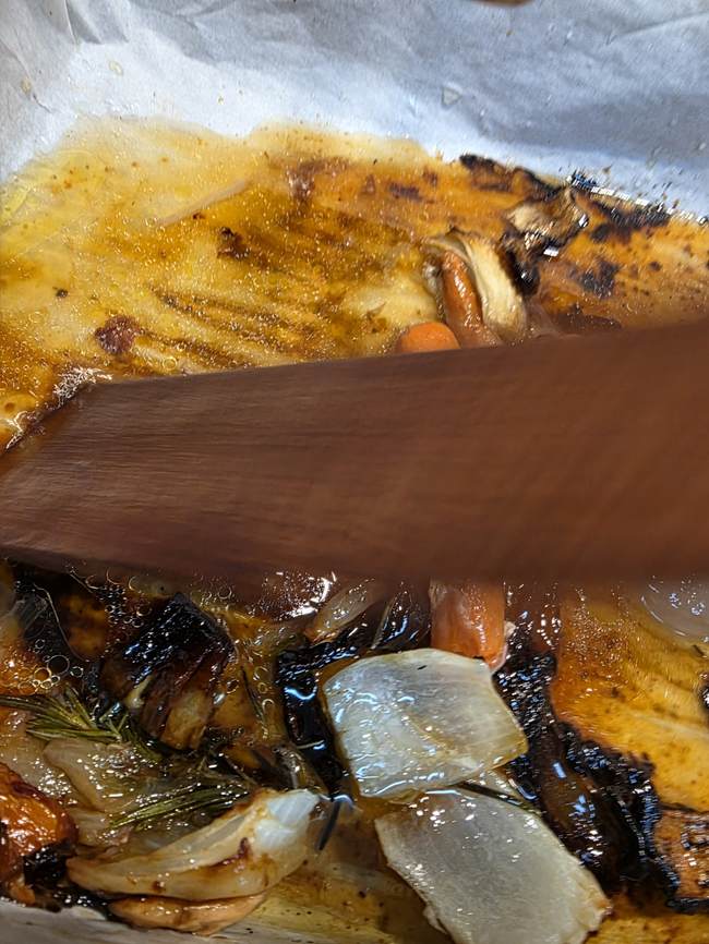 2. Take about a half a cup of the chicken broth and pour it into the roasting pan. Make sure you gently work it all over those veggies and get all the yummies off the paper (or the pan if you didn’t line it).