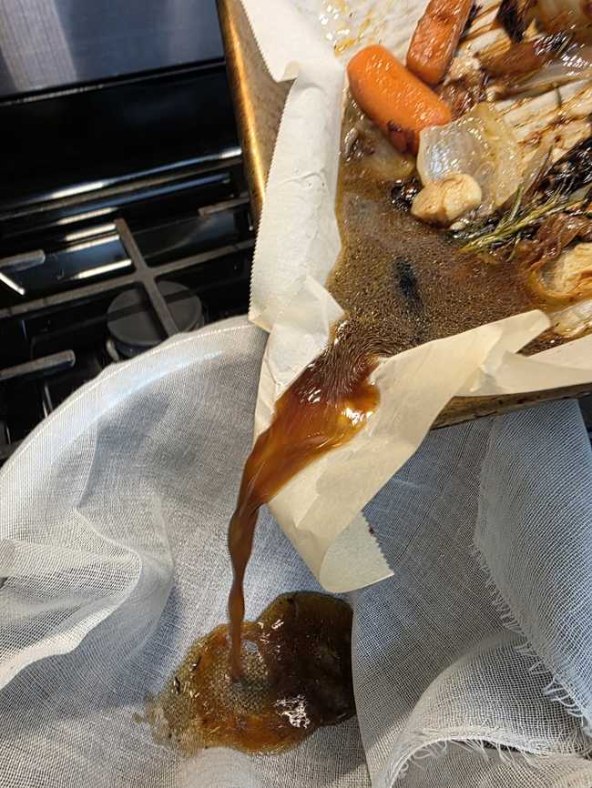 3. Then pour it through the cheesecloth into the saucepan. Squeeze the goodness out of those vegetables, too, as you get to the end.