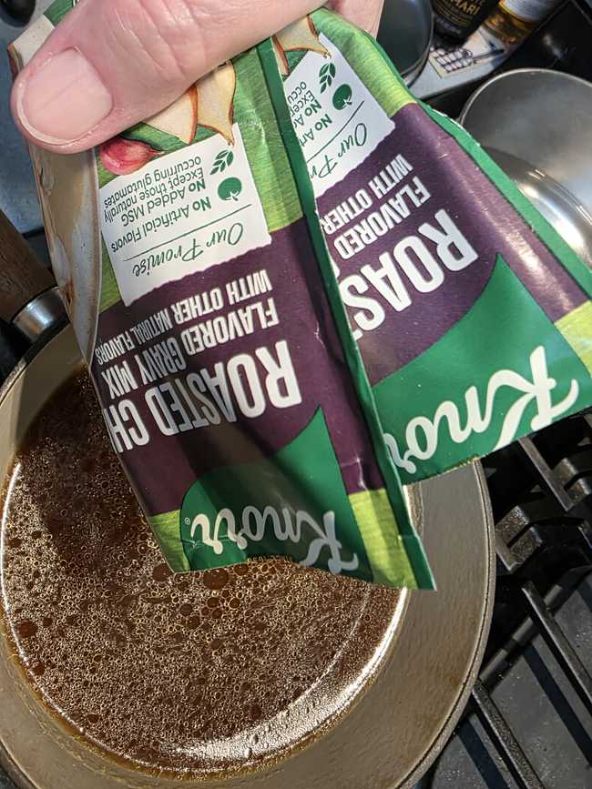 - 2 Knorr roasted chicken gravy packets (I use these because they are little more than a base, almost zero flavoring, and we’ll be ADDING plenty)