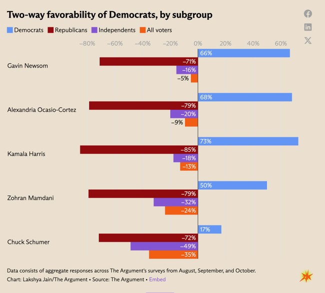The results are grim for Mamdani. Among self-identified Democrats and Independents alike and among voters at large, his numbers are actually considerably worse than those of Newsom, Ocasio-Cortez, and Harris.