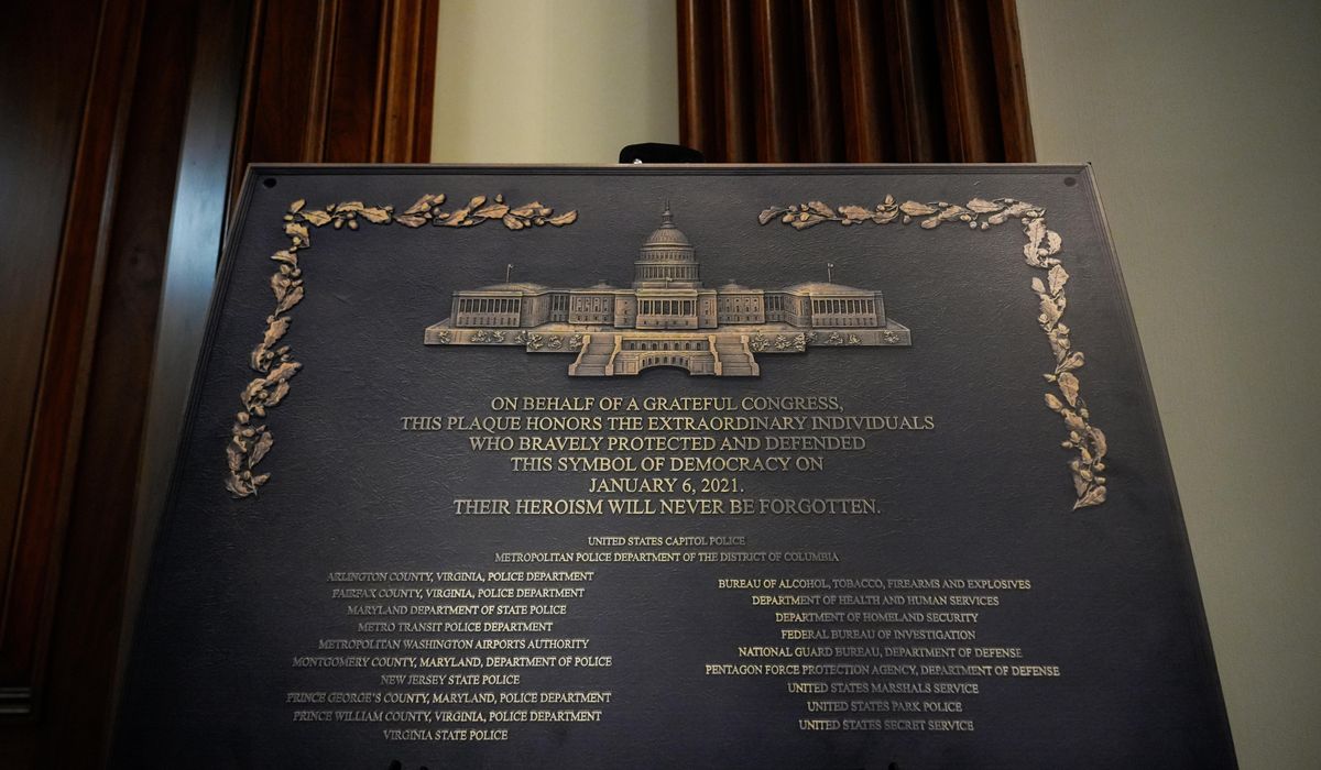 House Speaker Mike Johnson, Louisiana Republican, has yet to formally unveil the plaque. And the Trump administration’s Department of Justice is seeking to dismiss a police officers’ lawsuit asking that it be displayed as intended. The Architect of the Capitol, which was responsible for obtaining and displaying the plaque, said in light of the federal litigation, it cannot comment.