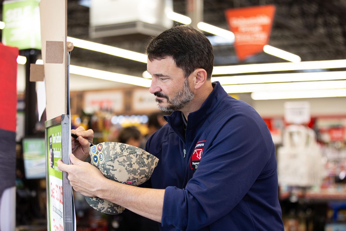 Hal Lawton, President and CEO of Tractor Supply, signs the honor wall at the Hometown Hero celebration at the Woodbridge, Virginia, Tractor Supply Store. Today, every Tractor Supply Store nationwide held a celebration in honor of National Hometown Heroes Day, and the company donated more than $1 million to military, veteran and first responder organizations.