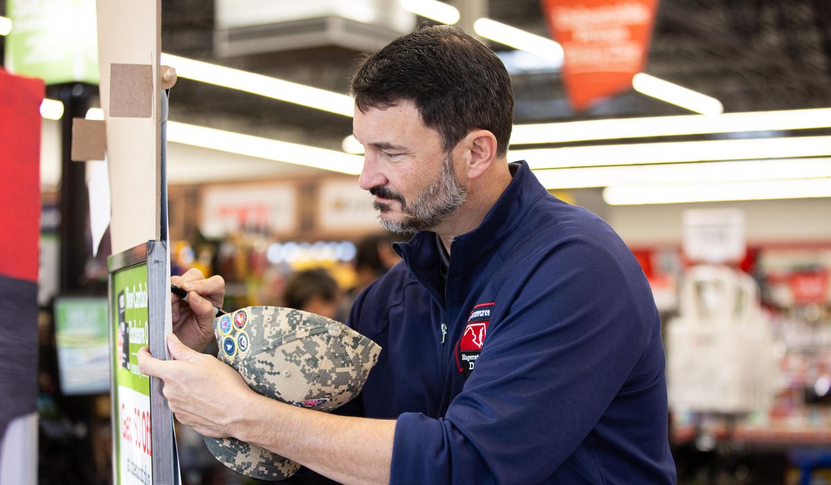 Hal Lawton, President and CEO of Tractor Supply, signs the honor wall at the Hometown Hero celebration at the Woodbridge, Virginia, Tractor Supply Store. Today, every Tractor Supply Store nationwide held a celebration in honor of National Hometown Heroes Day, and the company donated more than $1 million to military, veteran and first responder organizations.