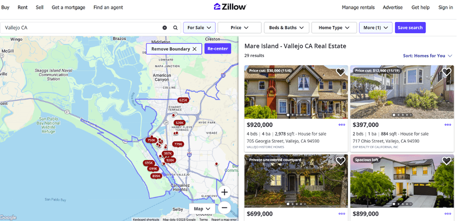 Zillow site; homes on Mare Island, Calif, former naval shipyard. Screen shot.