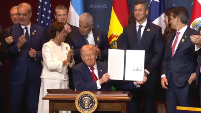 As Trump noted in his spoken remarks at the summit, the nations in this new coalition will be led by a U.S. military that will be fueled by spending not merely at the current $1 trillion level—but by upward of $1.5 trillion, with plans for bringing back battleships, starting with building 10 of them. He added that Cuba’s regime is on its last leg and will be brought down.