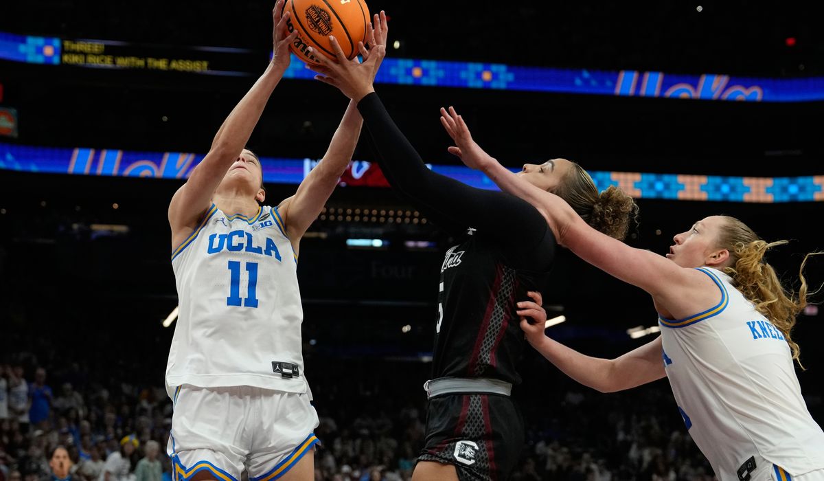 Offensively, the Bruins had a much easier time than in the semifinal game that saw the team score only 20 points in the first half. The Bruins surpassed that total in the opening 10 minutes against South Carolina. Kiki’s Rice 3-pointer just before the first-quarter buzzer made it 21-10 as the Bruins got off to a strong start and South Carolina struggled with 17% shooting, it’s poorest quarter of the season.