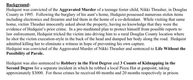 Douglas County Sheriff John Hanlin publicly opposed the clemency calling the murder calculated cold blooded and execution style. He said the decision to release Hedquist was shocking and irresponsible and that it rejected the justice delivered on behalf of Nikki Thrasher her family and her friends. Hanlin noted that Brown ignored objections from multiple law enforcement leaders including district attorneys and sheriffs who warned against early release.