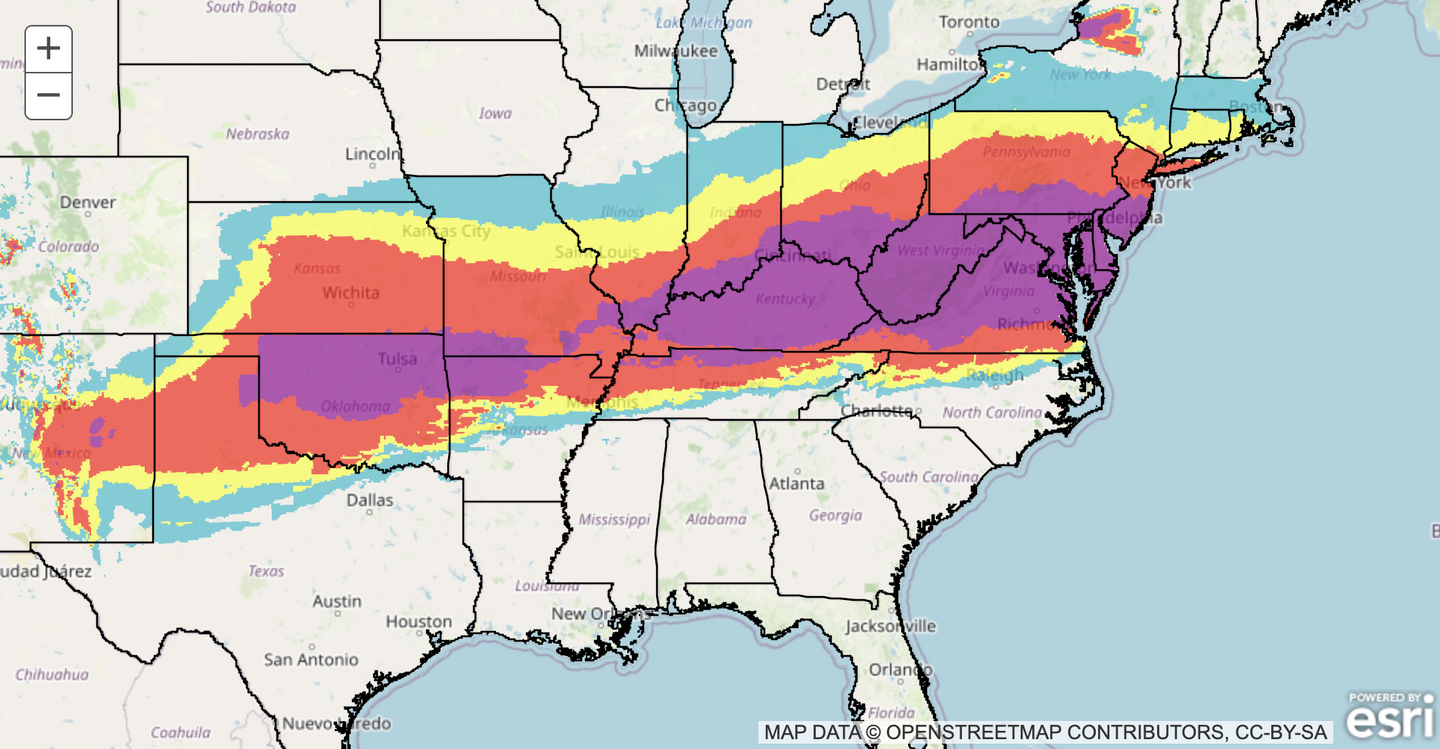 The weather service noted in its national forecast that heavy snow accumulations are likely in a large swath from the Southern Rockies and Plains eastward to the Mid-Atlantic and into New England, with local areas potentially seeing maxima above 12 inches.