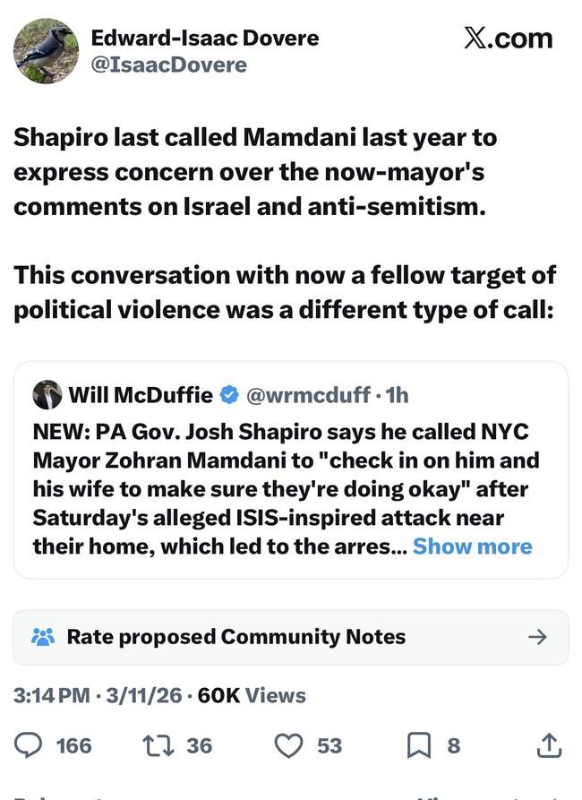 I want to correct something I posted earlier on X, which inaccurately implied that Mayor Mamdani was the target of political violence in last week’s ISIS inspired attempted terror attack in New York City. Law enforcement officials have said the two terror suspects threw improvised explosive devices at an anti-Islam demonstration and a counterprotest near Mayor Mamdani’s home Saturday, but did not say that he was the target. I apologize for the error and have deleted the original post.