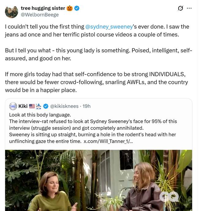 Sweeney is sitting up straight, burning a hole in the rodent’s head with her unflinching gaze the entire time. https://t.co/SVAHw529Jj pic.twitter.com/Ny2gGnoBz4— Kiki 🇺🇸🧙🏻♂️ (@kikisknees) November 6, 2025